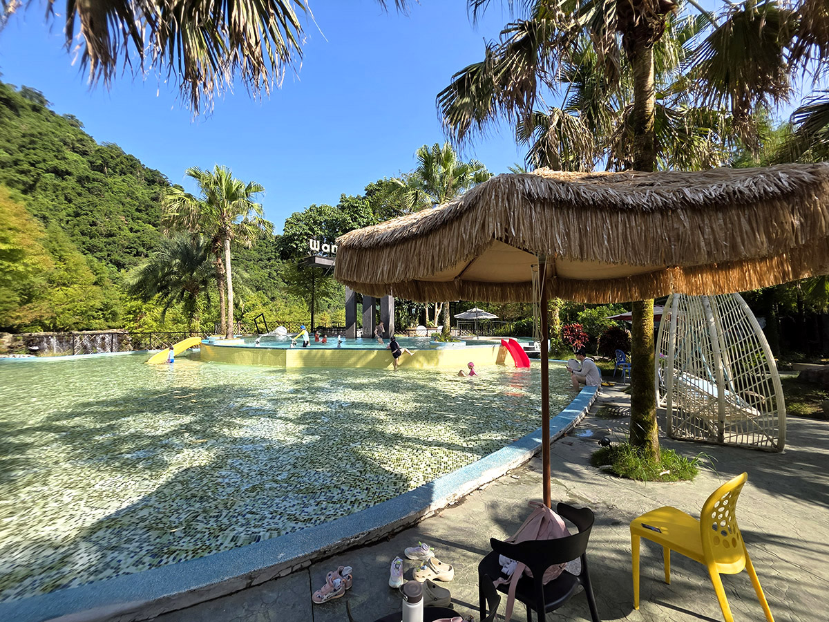 戲水池旁擺放多個南洋風味的遮陽傘與座位,不下水的爸爸媽媽可以坐在這裡照顧小朋友。