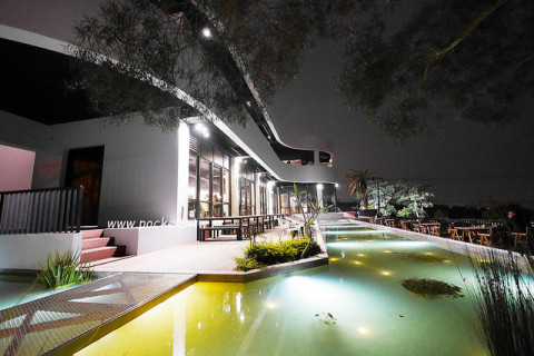 餐廳用以黑、白二色為主色,簡單典雅,每個座位之間距離不會太窄,大片落地窗引入自然採光,到了晚上還能看到台中夜景。戶外設計狹長型水池,前方擺放不少休閒座椅,一旁即是戶外用餐區,天氣涼爽時坐在這裡也很舒適。