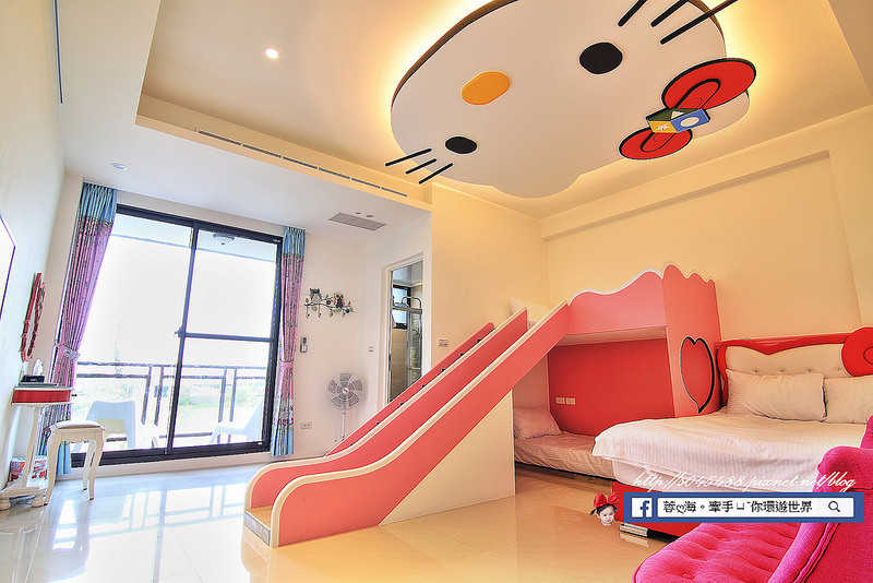 這裡每間房型都有不同主題風格,雙人房走浪漫時尚風格,親子房則是小朋友愛的kitty貓與拉拉熊,天花板上有大大的卡通圖案,非常亮眼。